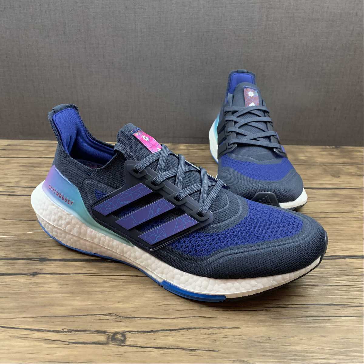 Introducing the adidas UltraBoost 21 Teaser. Designed by adidas, these running shoes in a stylish blue color are perfect for athletes seeking maximum comfort and performance. Boost cushioning technology ensures an energy-filled stride, while the lightweight construction offers optimal flexibility. Upgrade your running game with the adidas UltraBoost 21 Teaser.