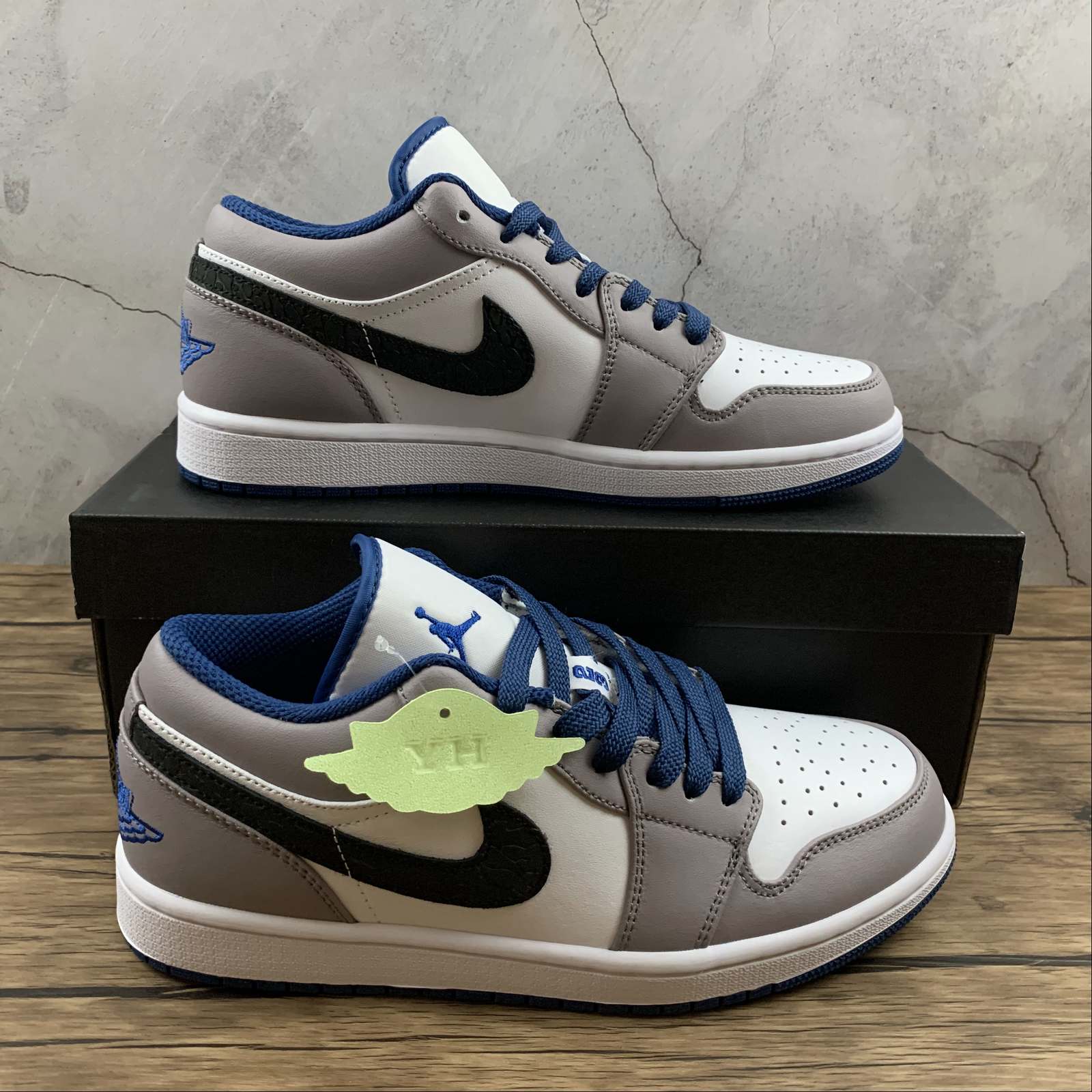 The Air Jordan 1 Low Cement True Blue, also known as the Cement True Blue, is a stylish and iconic sneaker from the Jordan brand. Featuring a sleek grey colorway, this shoe offers a trendy and versatile look. Step up your sneaker game with the Air Jordan 1 Low Cement True Blue.