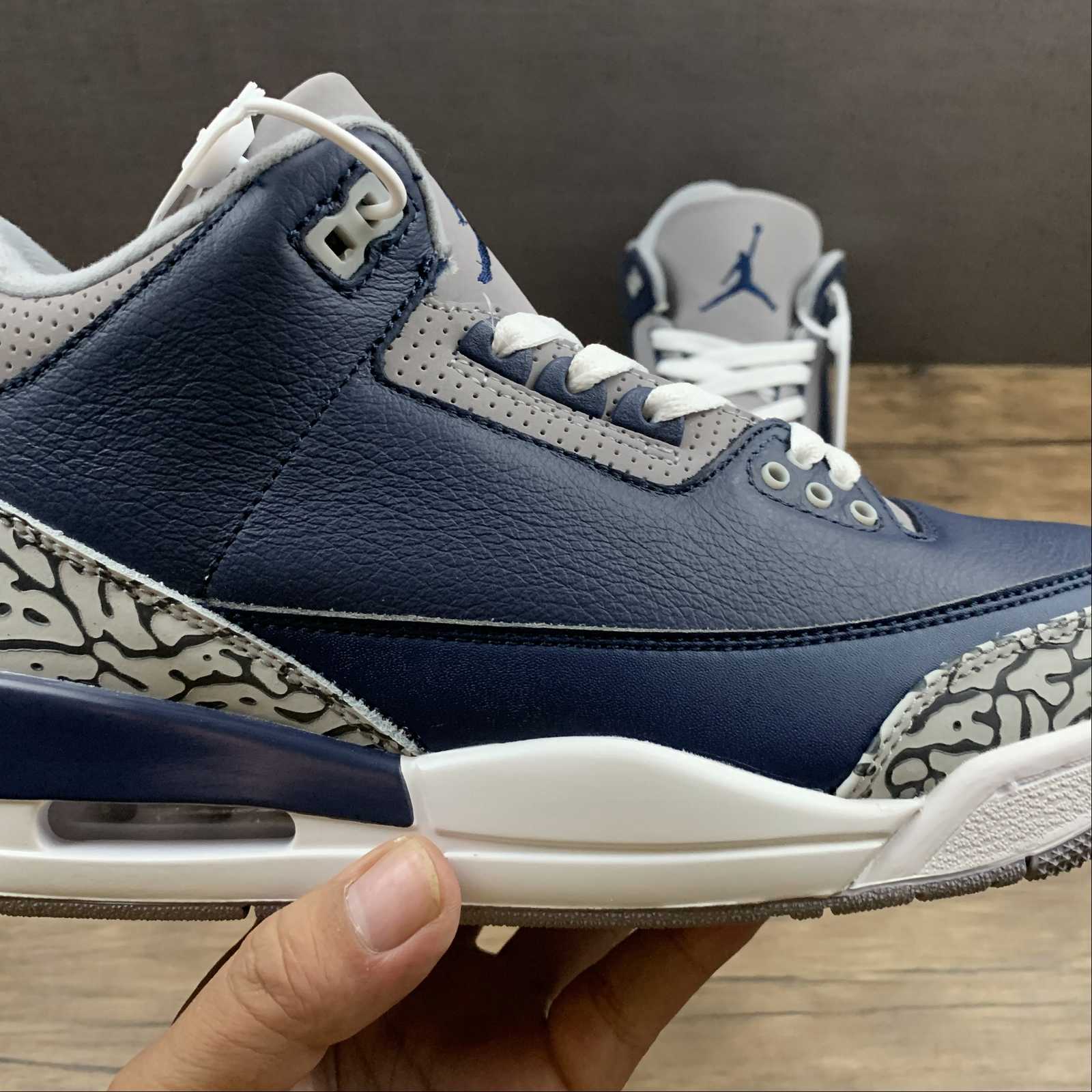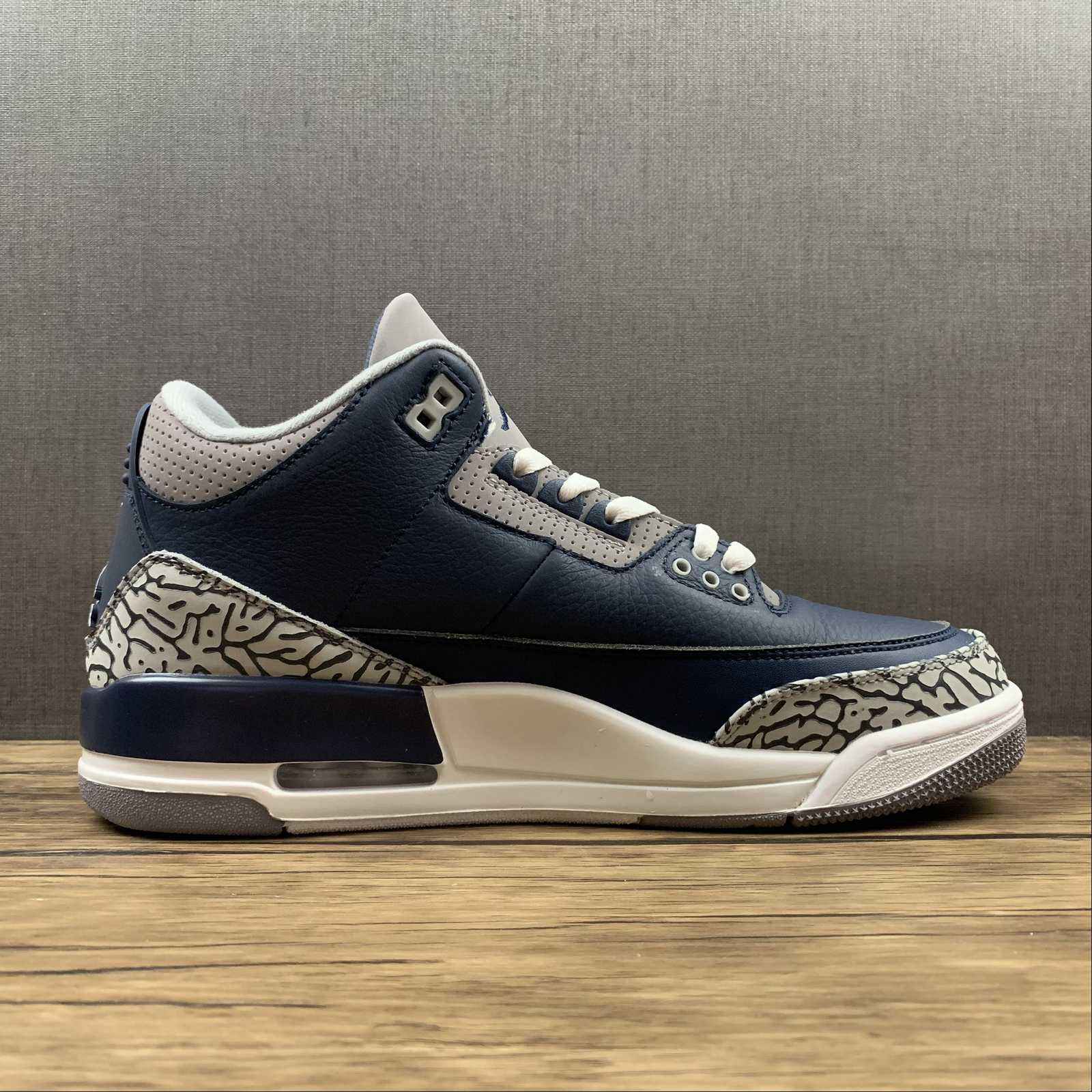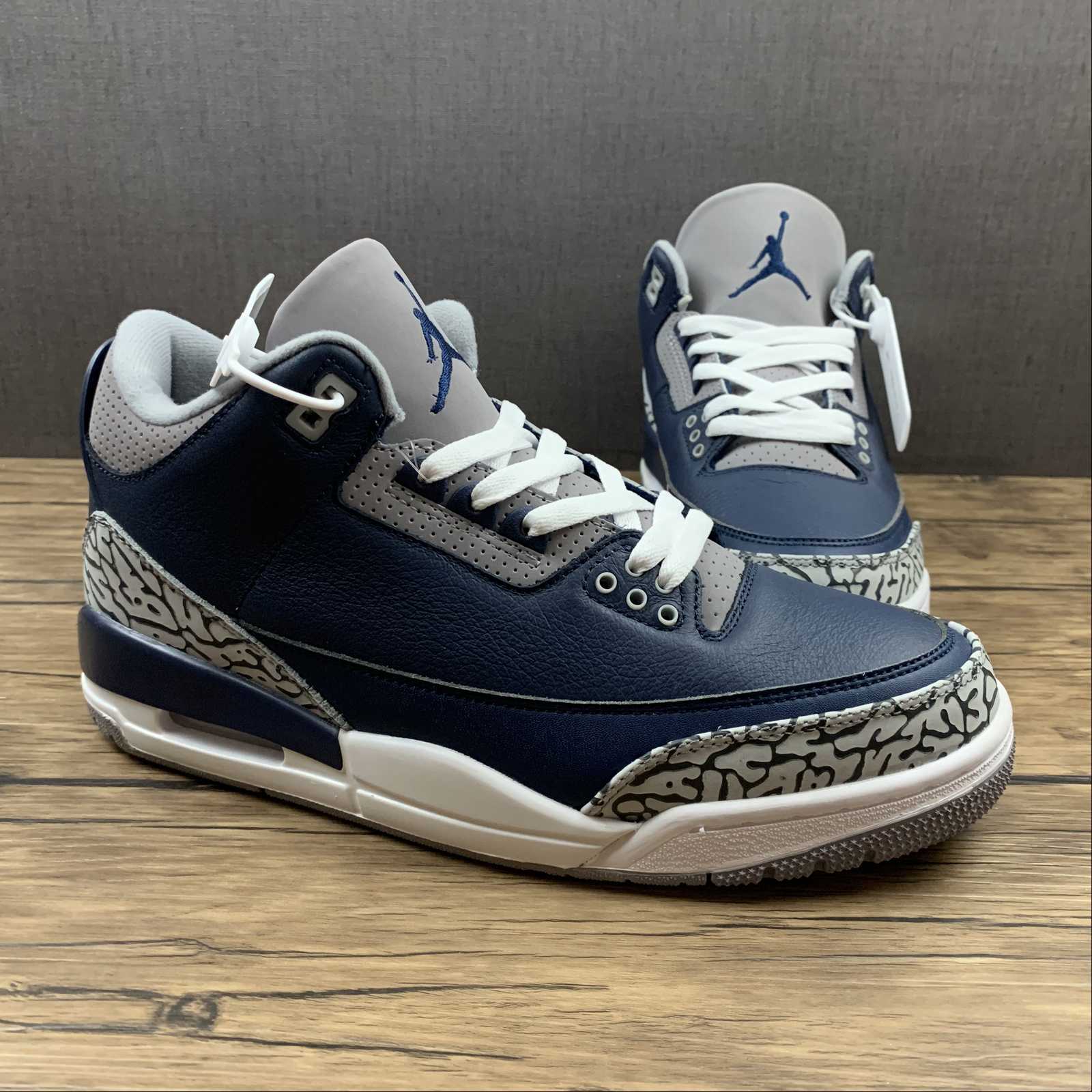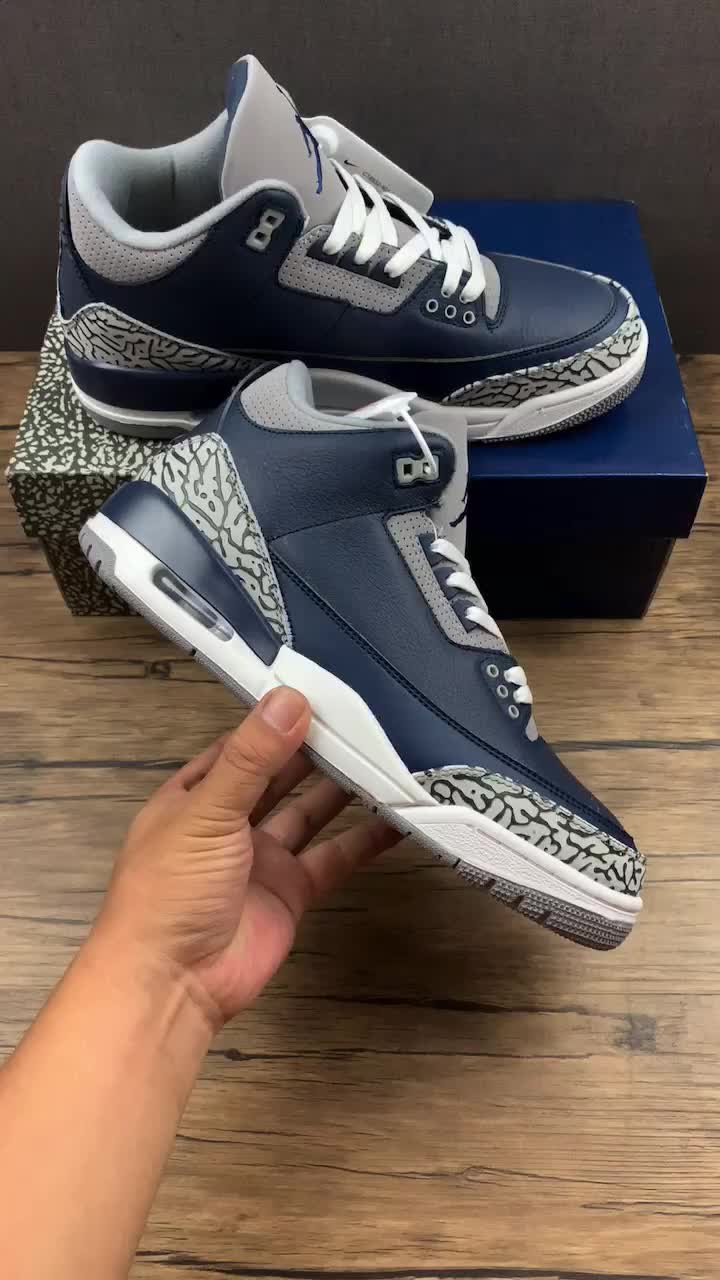 Introducing the Air Jordan 3 Retro Georgetown by Jordan. This iconic sneaker, also known as Georgetown, features a sleek navy colorway. With its timeless design and signature Air cushioning, these sneakers are perfect for both style and comfort. Shop now and elevate your sneaker game.